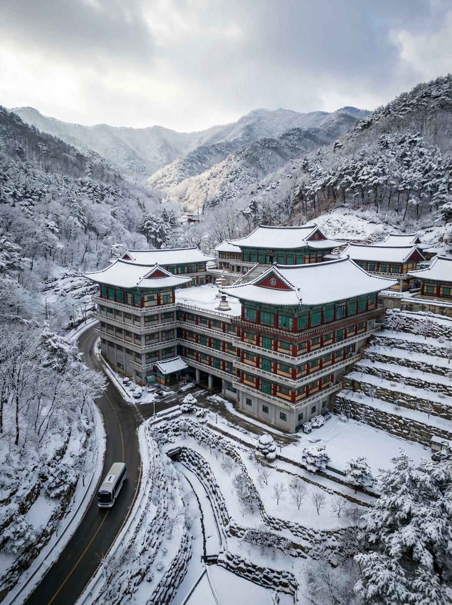 겨울철 눈 내린 구인사는 정말 특별한 풍경을 선사했습니다. 50여 동의 전각 지붕마다 하얀 눈이 수북이 쌓여 마치 한 폭의 수묵화 같았습니다. 특히 주홍빛 단청과 하얀 설경의 대비는 왜 이곳이 사진 애호가들에게 최고의 피사체로 손꼽히는지 알 수 있게 했습니다.