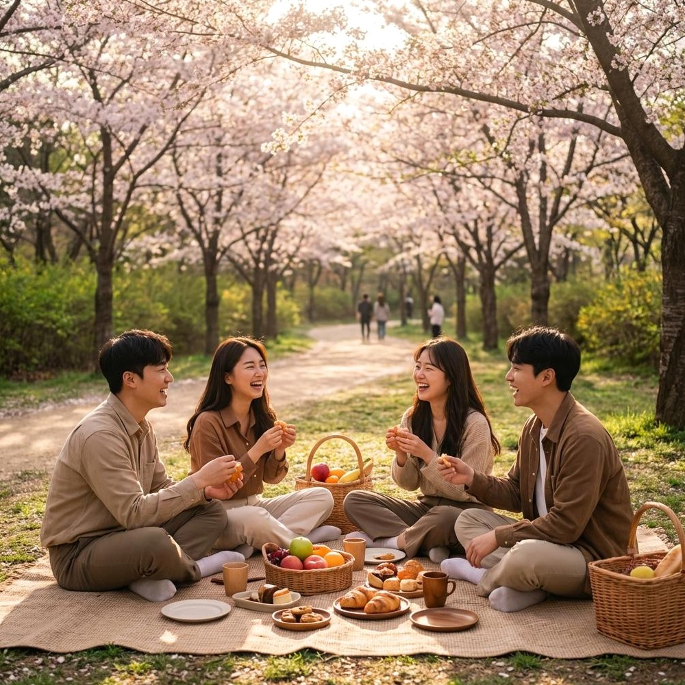 서울숲은 넓고 아름다운 공원으로, 벚꽃 시즌에는 피크닉 명소로 손꼽힙니다. 특히 '거울연못 옆 메타세콰이어길'이나 '바람의 언덕' 인근은 인파가 덜하여 여유로운 피크닉 감성을 만끽하기 좋습니다.
