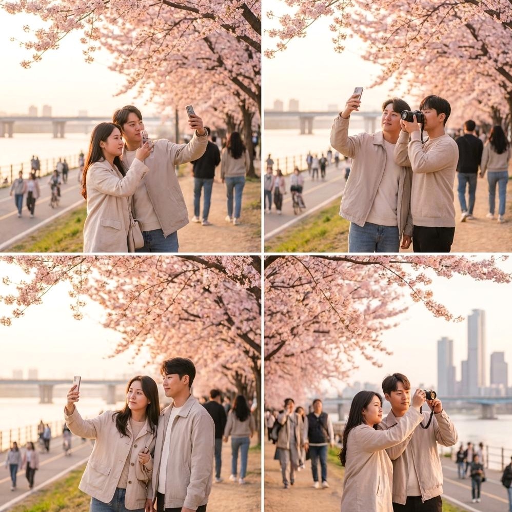 아름다운 벚꽃 배경에서 인생샷을 남기는 것은 벚꽃 여행의 하이라이트입니다. 베스트 포토존은 벚꽃이 가장 풍성하게 피어 있는 터널이나, 호수/강변과 어우러진 배경입니다. 인물 구도는 벚꽃을 배경으로 인물을 살짝 측면에 배치하거나, 벚꽃 가지 사이로 자연스럽게 얼굴을 내미는 구도가 좋습니다.