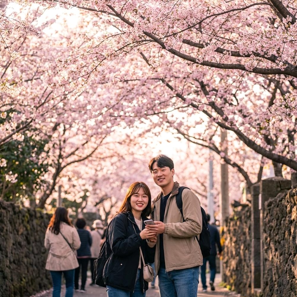2026년 3월 24일 개화, 3월 31일 절정 예상. 제주의 대표적인 벚꽃 거리로, 왕벚나무가 터널을 이룹니다. 제주시 시외버스터미널에서 도보 이동이 가능하여 대중교통 이용이 편리합니다. 주변에 게스트하우스와 저렴한 식당들이 많아 배낭여행객에게 추천합니다. 혼잡을 피하려면 아침 일찍 방문하거나 야간 개장을 활용하세요.