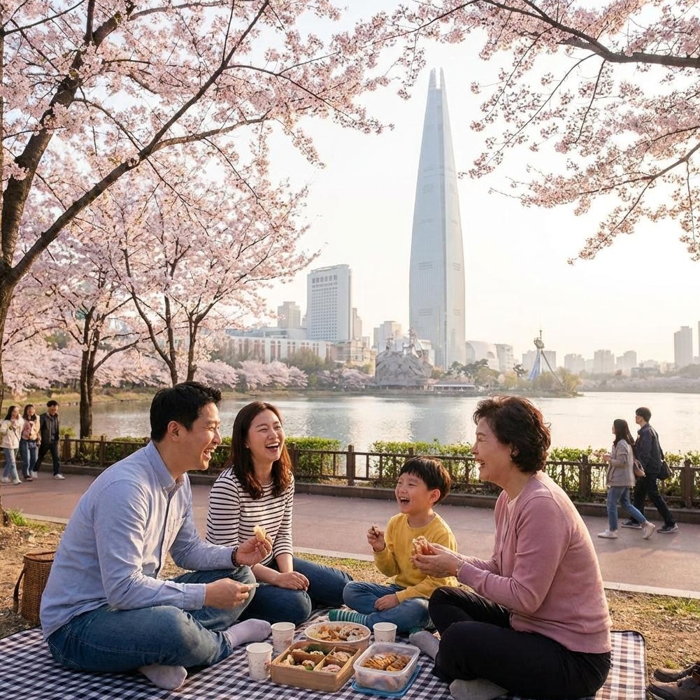 2026년 4월 3일 개화, 4월 10일 절정 예상. 롯데월드타워를 배경으로 벚꽃이 아름다운 곳입니다. 지하철 2, 8호선 잠실역과 가깝습니다. 호수 주변에는 가성비 좋은 카페와 식당들이 많으니 참고하세요. 주말보다는 평일 오전에 방문하는 것이 한적합니다.