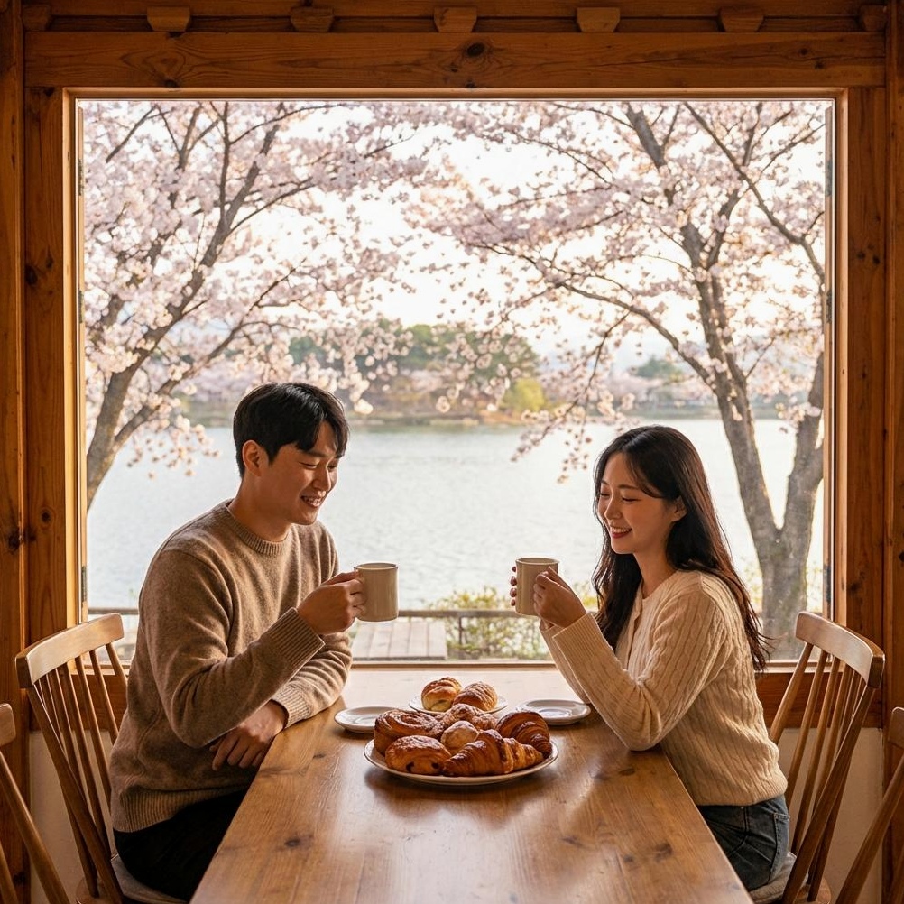 감성 카페로는 '벤자마스'가 대표적입니다. 통유리창 너머로 보문호반의 풍경과 벚꽃을 감상할 수 있으며, 쾌적한 실내 공간과 아이들이 좋아할 만한 베이커리 메뉴도 다양합니다. 야외 테라스는 아이들이 잠시 뛰어놀기에도 안전한 공간을 제공합니다.