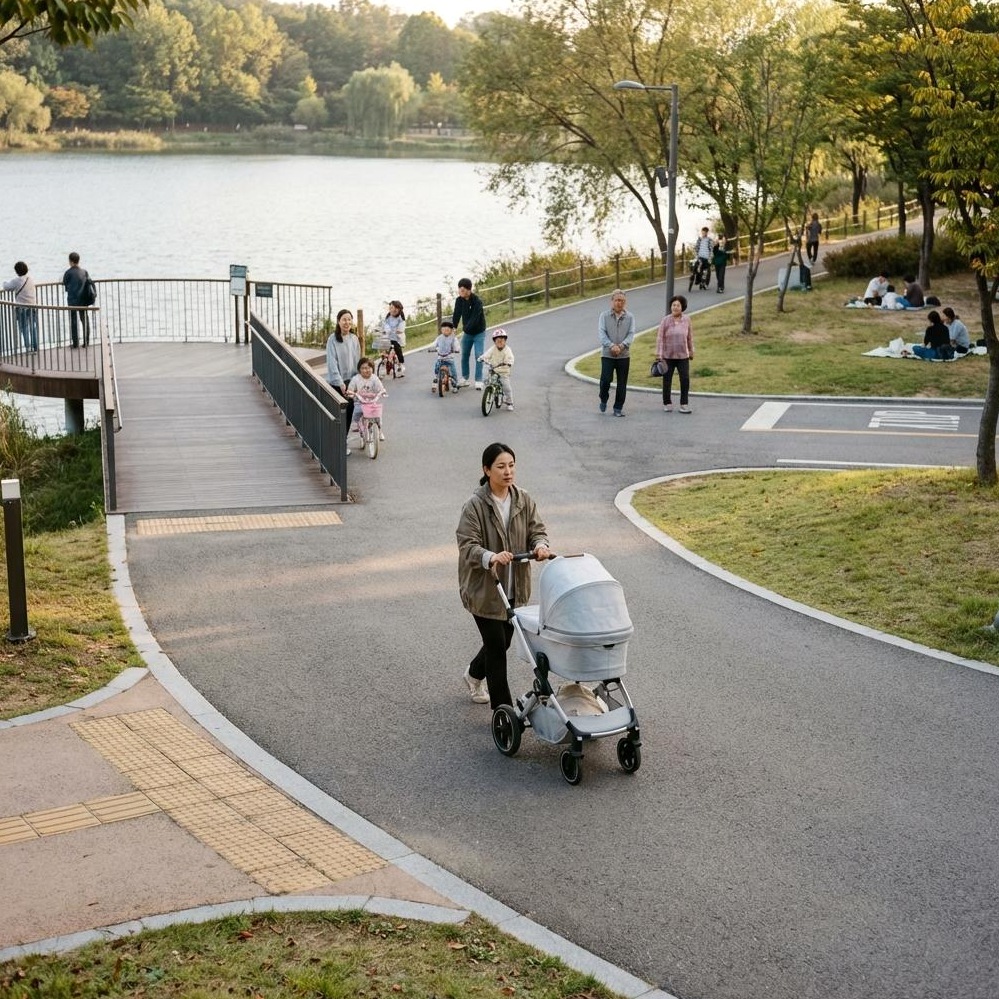 유아가족 방문객을 위한 실전 유모차 루트를 공개합니다. 공원 중앙광장에서 동측 카페거리로 이어지는 순환 코스는 비교적 평탄하고 보행 환경이 좋아 유모차 이용에 가장 적합합니다. 이 코스는 호수 풍경을 감상하며 여유롭게 산책하기 좋습니다.