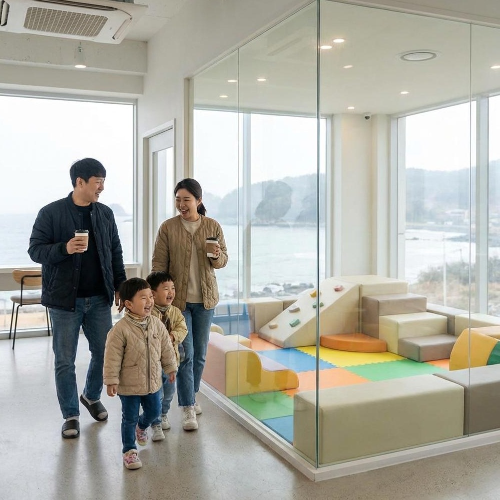 1층은 개방감 있는 통창으로 시원한 전망을 제공하며, 아이들과 함께 편안하게 이용할 수 있는 넓은 공간이 특징입니다.