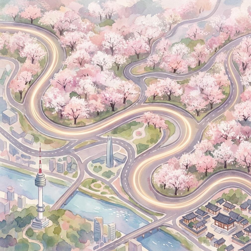 효율적인 벚꽃 드라이브를 위한 전문가 추천 '최적 코스'. 남산, 워커힐 길, 올림픽공원 등 서울 핵심 명소 엮어 동선 낭비 없이 최고의 경험 제공. 오전 북악, 오후 여의도, 저녁 안양천 야경 드라이브 큐레이션된 일정으로 품격 있는 드라이브 완성.