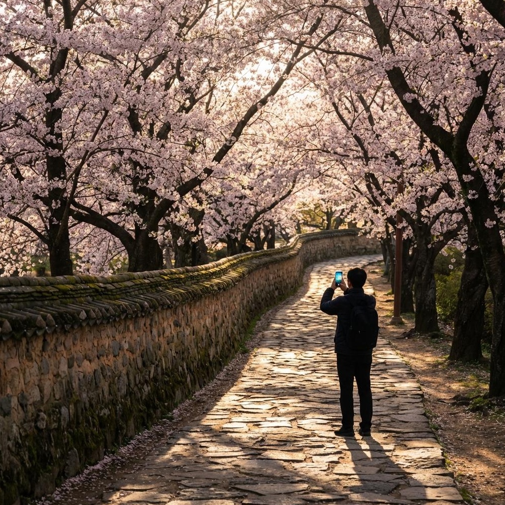 대릉원 돌담길은 경주 벚꽃의 상징이지만, 진정한 '인생샷'은 남들이 모르는 각도에서 탄생합니다. 공식 가이드에 따르면, 이른 아침 또는 늦은 오후의 부드러운 사선광이 가장 이상적인 촬영 조건을 제공합니다.