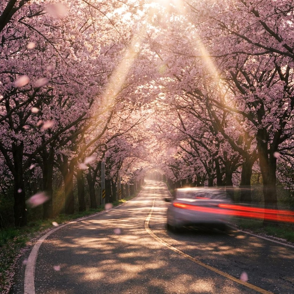 차창 밖으로 쏟아지는 벚꽃잎은 마치 영화의 한 장면처럼 로맨틱한 분위기를 연출합니다. 안전 운전하며 아름다운 순간을 만끽하세요.