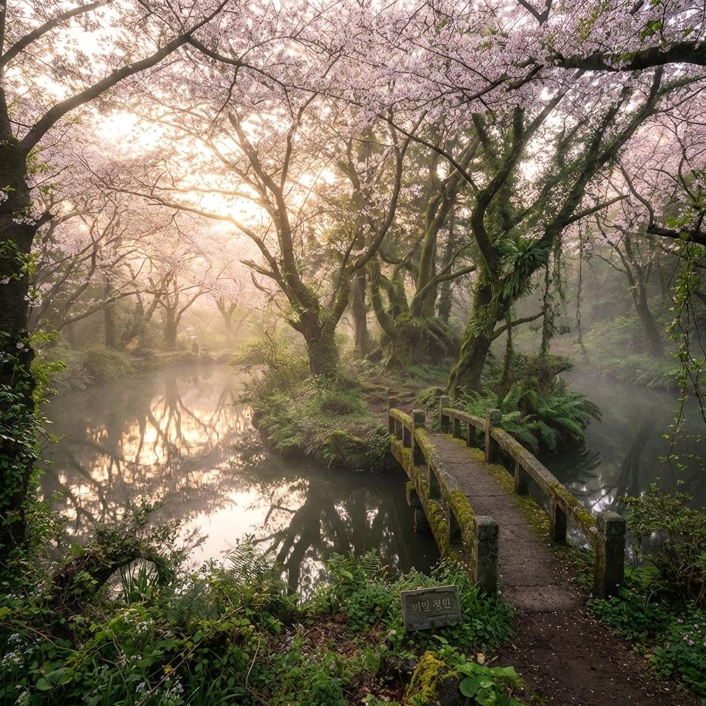 두 번째 '인생샷' 스팟은 '숲속 작은 연못'입니다. 벚나무가 수면에 그림 같은 반영을 만들고, 연못가 벤치는 동화 같은 사진을 위한 포토존입니다.