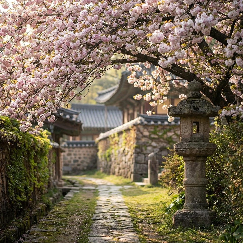 경내에 위치한 작은 연못 주변의 오래된 겹벚꽃 나무 아래는 운치 있는 사진을 위한 스팟입니다. 고목의 가지가 연못 위로 드리워져 동양적인 미를 더하며, 잔잔한 물결에 비치는 겹벚꽃 반영 사진도 놓칠 수 없는 포인트입니다.
