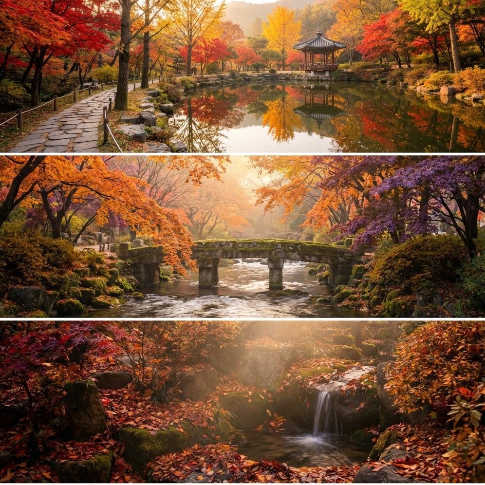 각 원마다 계절별로 다른 아름다움을 지니고 있지만, 가을에는 특히 이끼원의 초록빛과 단풍의 붉은빛이 대비를 이루며 최고의 감동을 선사합니다.