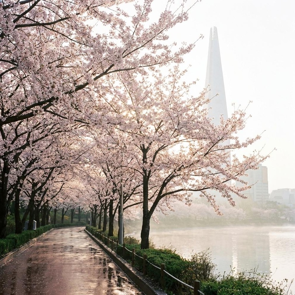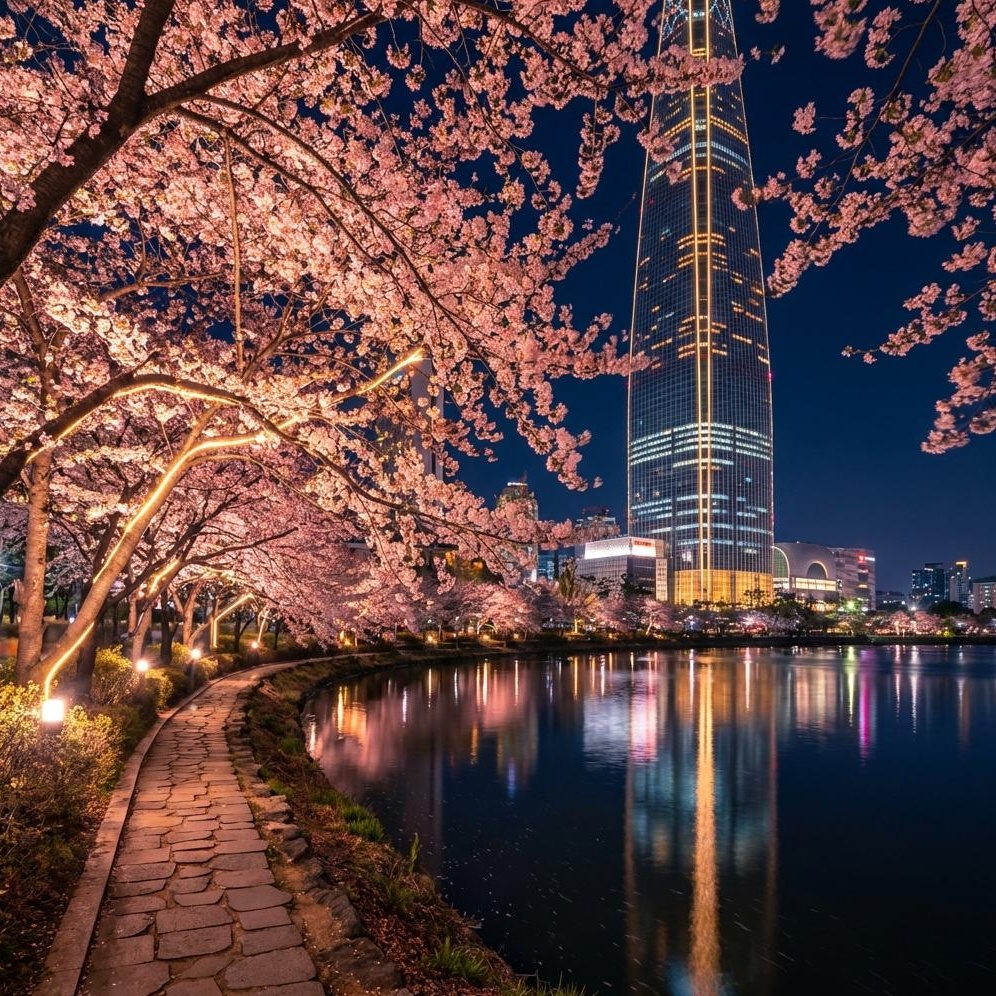 롯데월드타워 배경, 호수와 벚꽃 비경, 동화 같은 분위기까지. 가족 모두 편안하게 추억 만들 공간입니다. 아이들과 타워 역사 등 교육적 대화도 좋아요.