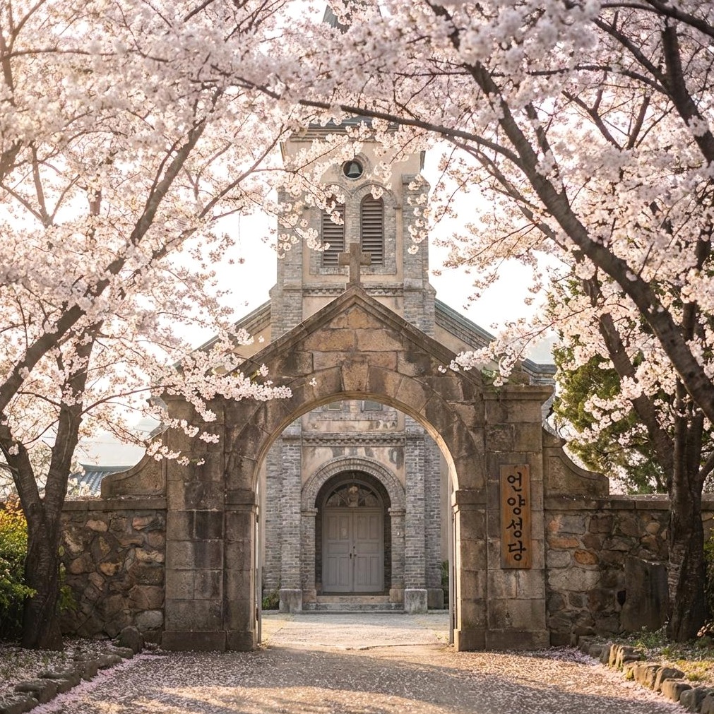 분석해 보니, 성당 종탑을 배경으로 한 아치형 입구는 놓쳐선 안 될 프라이빗 포토존입니다. 주변 산책로를 따라 여유로운 벚꽃길을 거닐며 진정한 힐링을 경험해보세요.