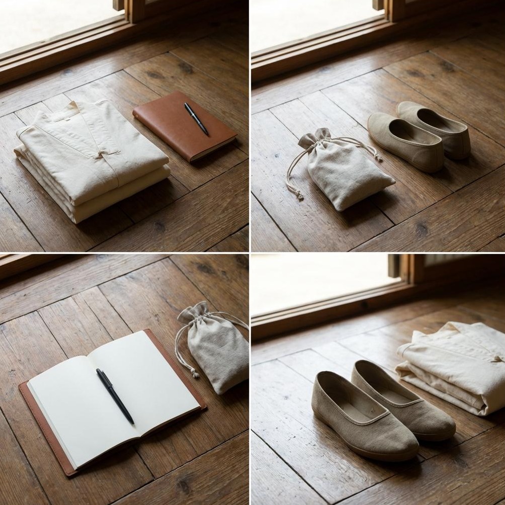 간소한 짐은 마음 평화에 도움. 불필요한 물품 줄여 가볍게. 소용량 세안용품, 부피 작은 옷 추천. 개인 방석이나 책도 좋습니다.
