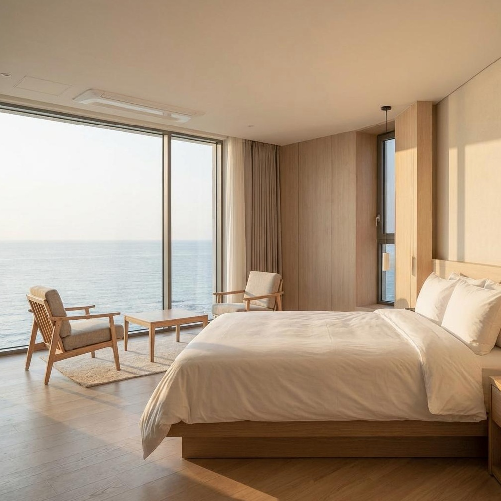 각 객실은 전면 통유리창을 통해 서해의 아름다운 풍경을 조망합니다. 특히 스위트룸 개별 테라스에서는 황홀한 일몰 감상이 가능해 '인생샷' 명소로 손꼽힙니다.