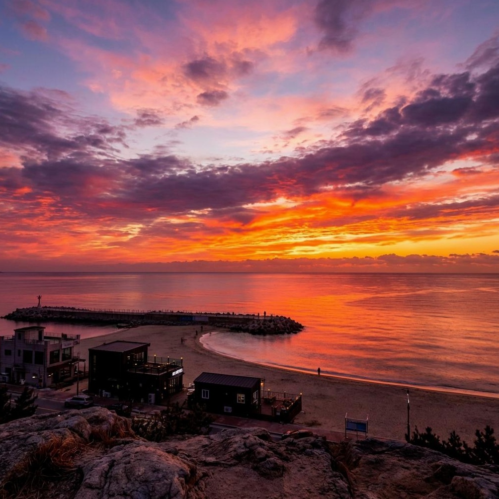 안목해변의 아침과 저녁은 각기 다른 매력을 선사합니다. 특히 동해의 장엄한 **일출**과 바다를 붉게 물들이는 **일몰**은 놓쳐서는 안 될 절경입니다. 가장 아름다운 풍경을 감상할 수 있는 명당 스팟과 함께, 번잡함 없이 여유롭게 일출/일몰을 즐길 수 있는 **최적의 시간대와 동선**을 알려드립니다. 따뜻한 커피 한 잔과 함께 잊지 못할 순간을 경험하세요.